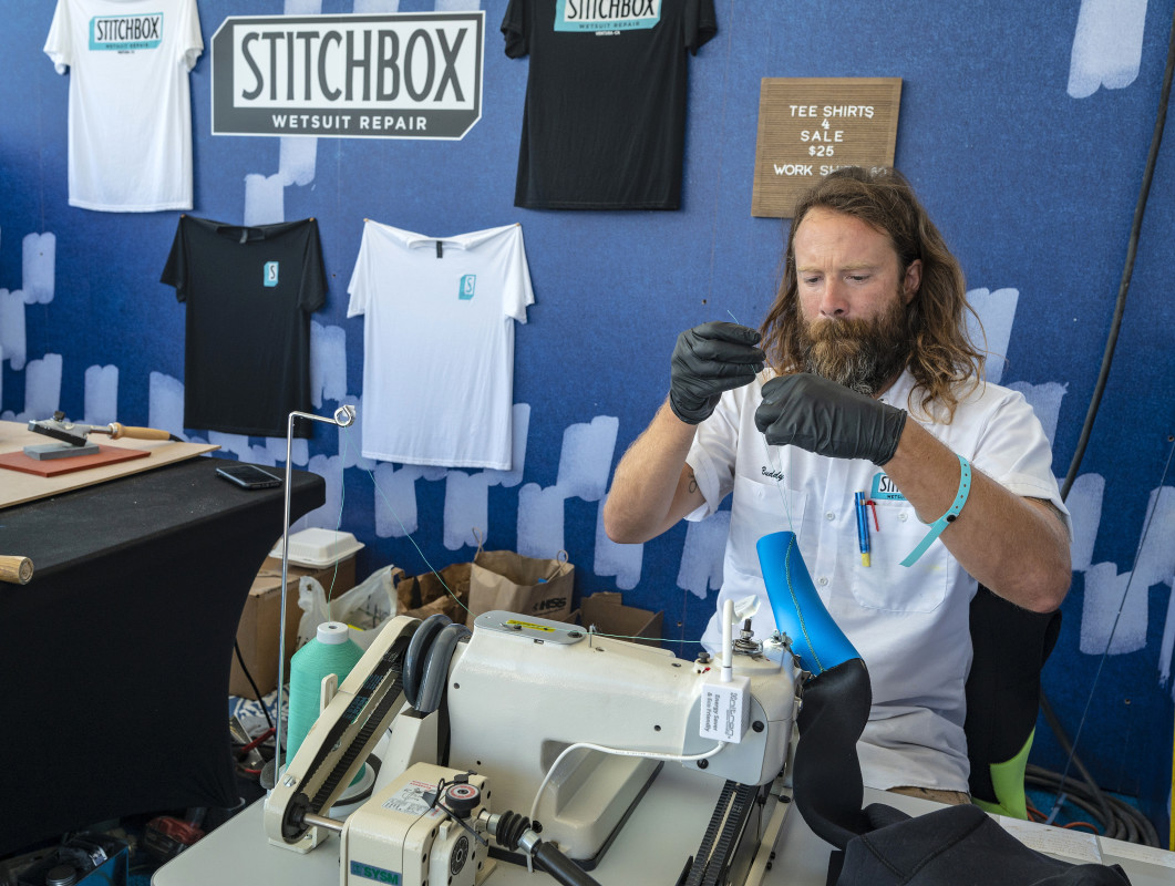 Buddy Pendergast, founder of Stitchbox Wetsuit Repair in Ventura, demonstrates wetsuit repair techniques at the US Open of Surfing. Photo: Mark Rightmire/MediaNews Group/Orange County Register via Getty Images. Mark Rightmire/MediaNews Group/Orange County Register via Getty Images.